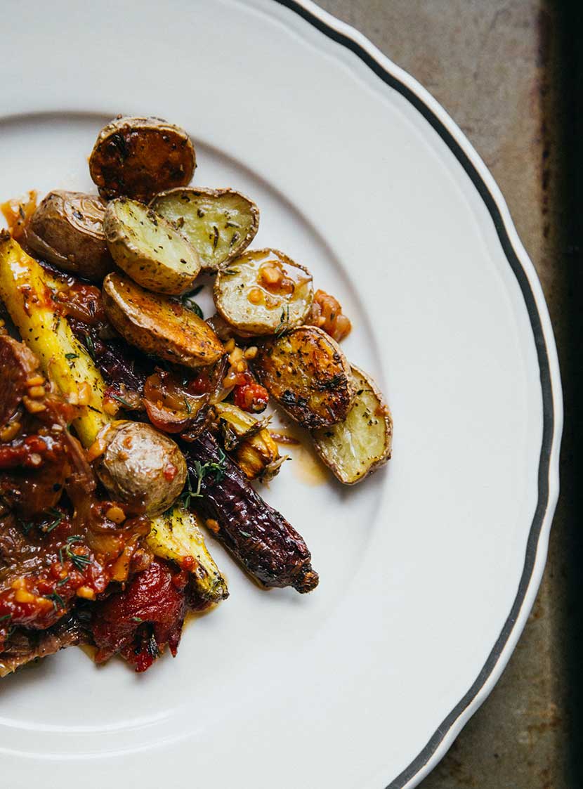Προθερμαίνουμε το φούρνο στους 200 βαθμούς στον αέρα. Κόβουμε τις μελιτζάνες σε χοντρά κομμάτια. Τις αραδιάζουμε σε λαμαρίνα και τις ραντίζουμε με ελάχιστο ελαιόλαδο. Τις ψήνουμε σε δυνατό φούρνο για 15΄ να καψαλιστούν. Όταν μισομαλακώσουν οι πατάτες, προσθέτουμε στην κατσαρόλα τις ψημένες μελιτζάνες και το υπόλοιπο ελαιόλαδο. Σιγοβράζουμε για επιπλέον 15′.