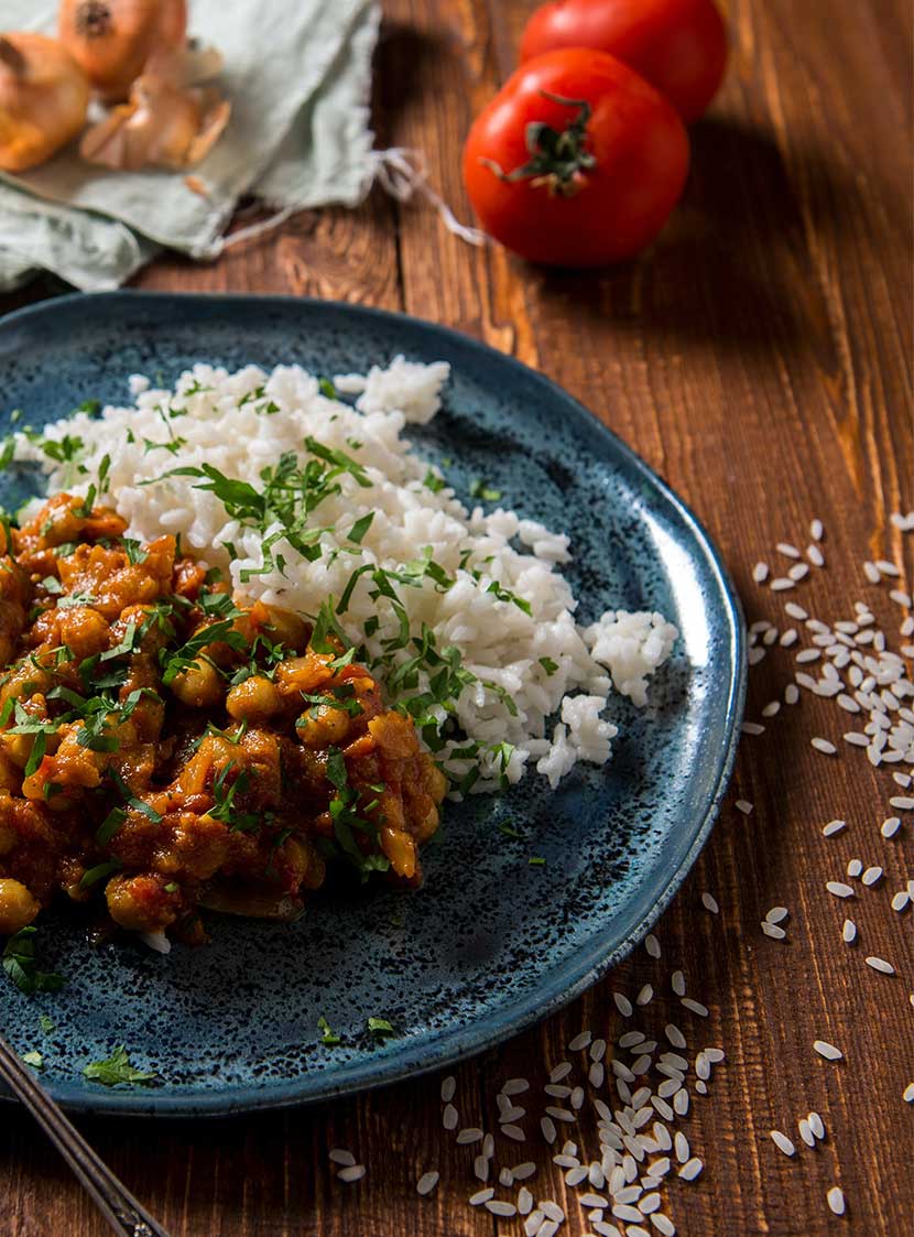 Ρεβυθόρυζο κοκκινιστό με μελιτζάνες